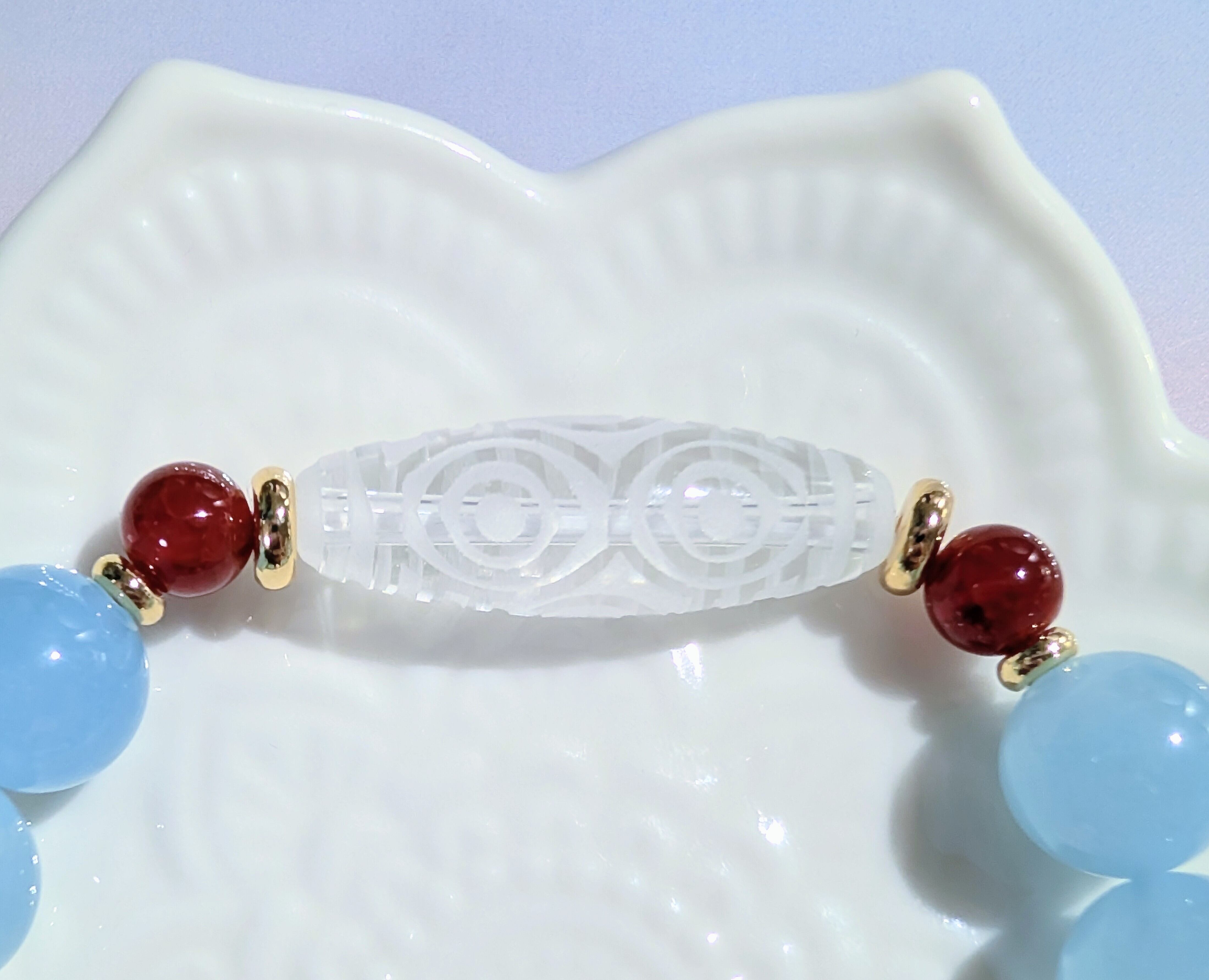 ・天珠の中でも特に強力な力を持つとされ、「天珠の王」とも呼ばれ龍の眼力によって魔を払い、財運を呼び込むとされ、困難を乗り越え成功へと導く力があると信じられています。また、内に秘めたエネルギーを引き出し、持ち主をあらゆる障害から守ります。