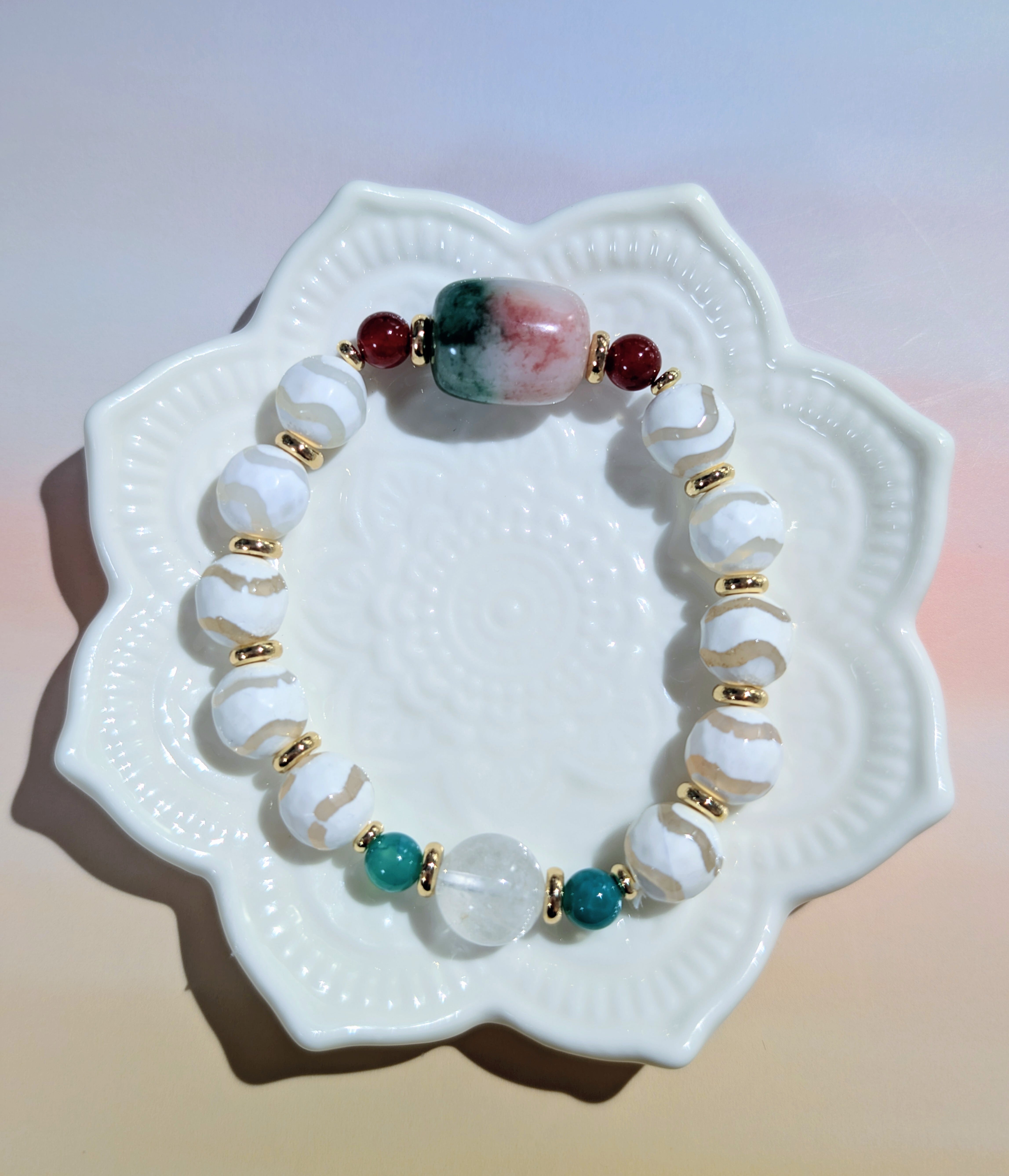 ・水紋天珠、ピンクや緑のグラデーションが綺麗な花翡翠を組み合わせた、唯一無二の天珠ブレスレットに仕上がりました。