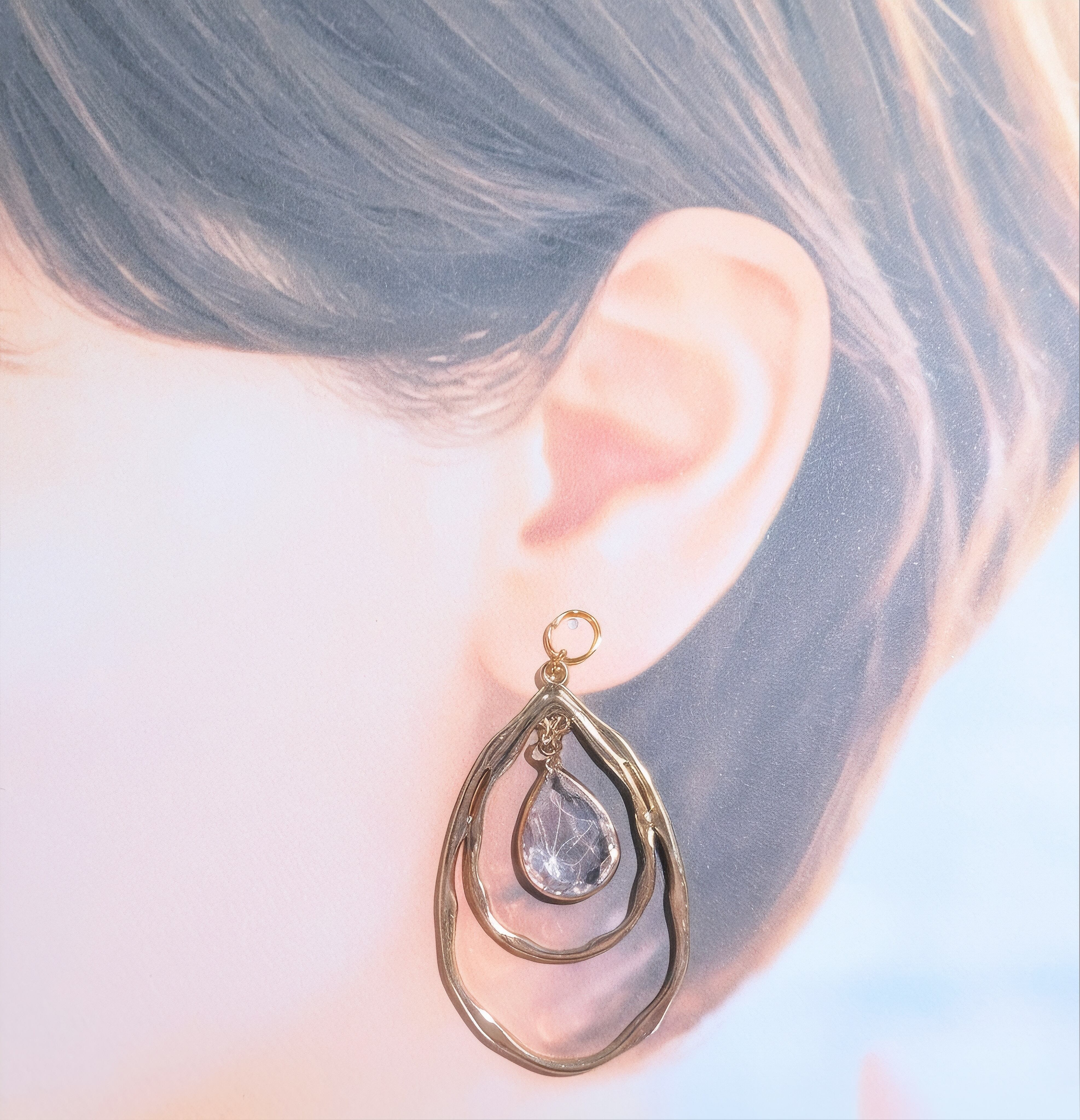ダブルリングの中にしずく型ガラスパーツが揺れる存在感あるチャーム