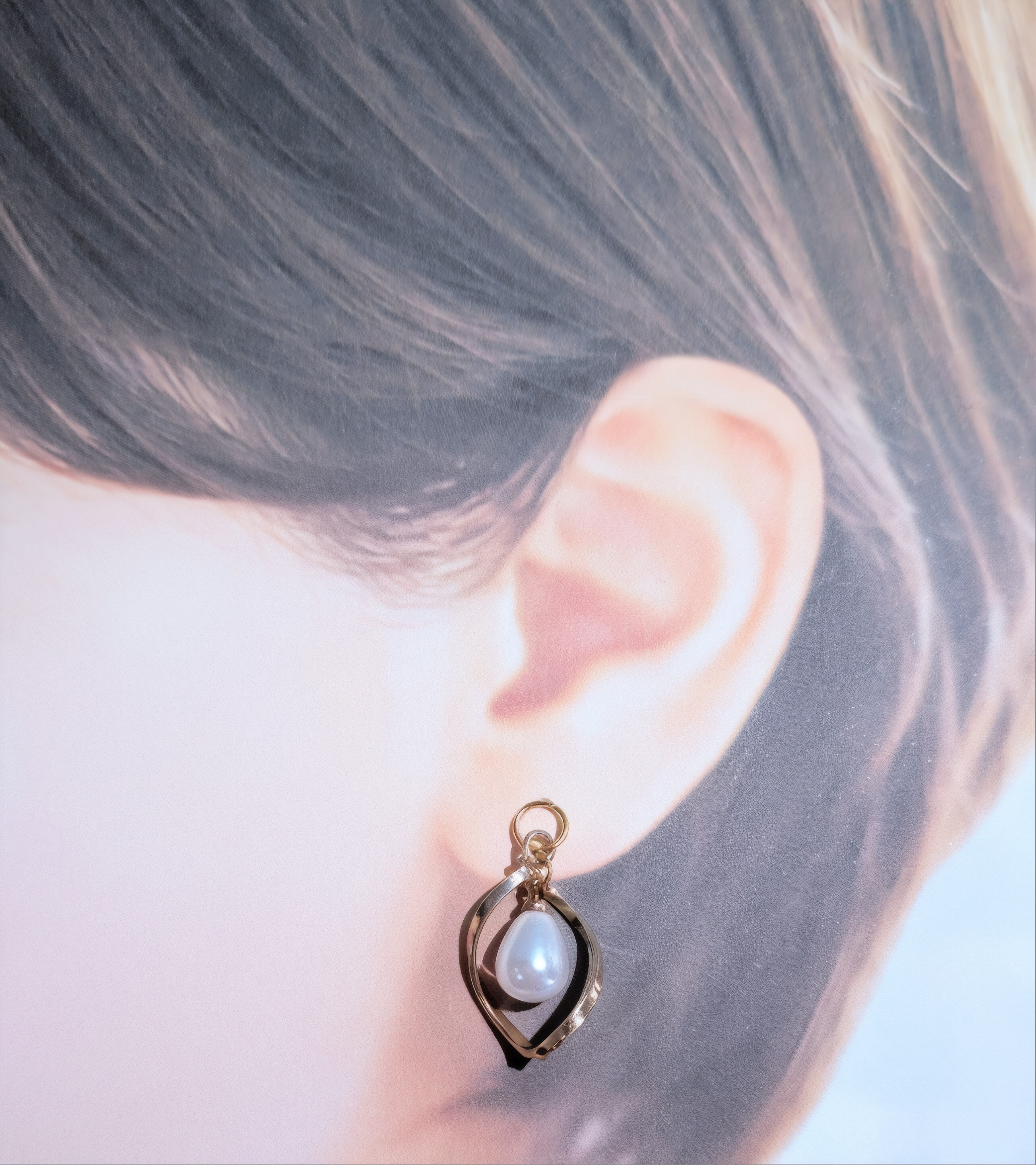 ツイストパーツの中でしずく型のパールが揺れるチャーム