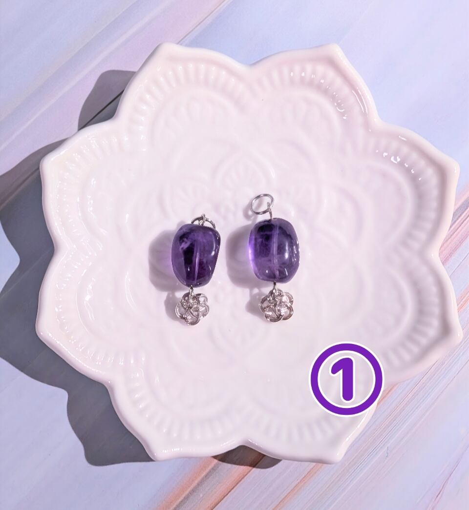 アメジストとシトリンの天然石におめでたい日本結びの梅結びのパーツが揺れる和風チャーム