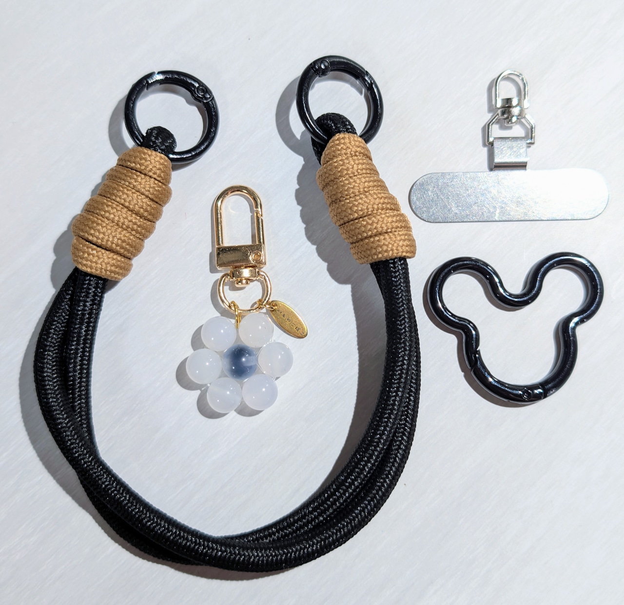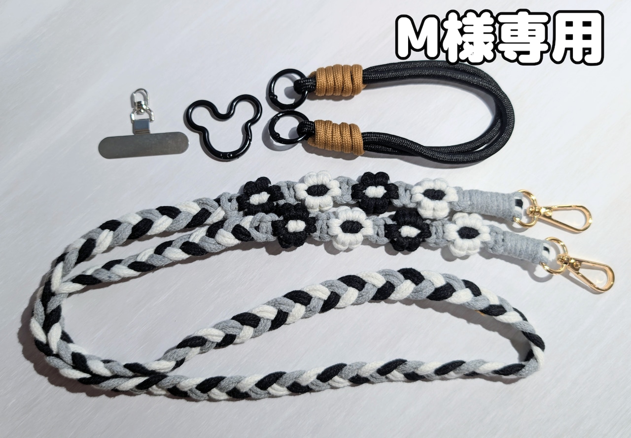 M様専用 売約済 3WAYスマホショルダー スマホショルダーストラップ お洒落可愛い 手作りニット織りショルダーストラップベルト・可愛いネズミ型カラナビ&360°回転式ストラップホルダーパーツ付・延長ストラップ付き・ワンちゃん 花あみ首輪