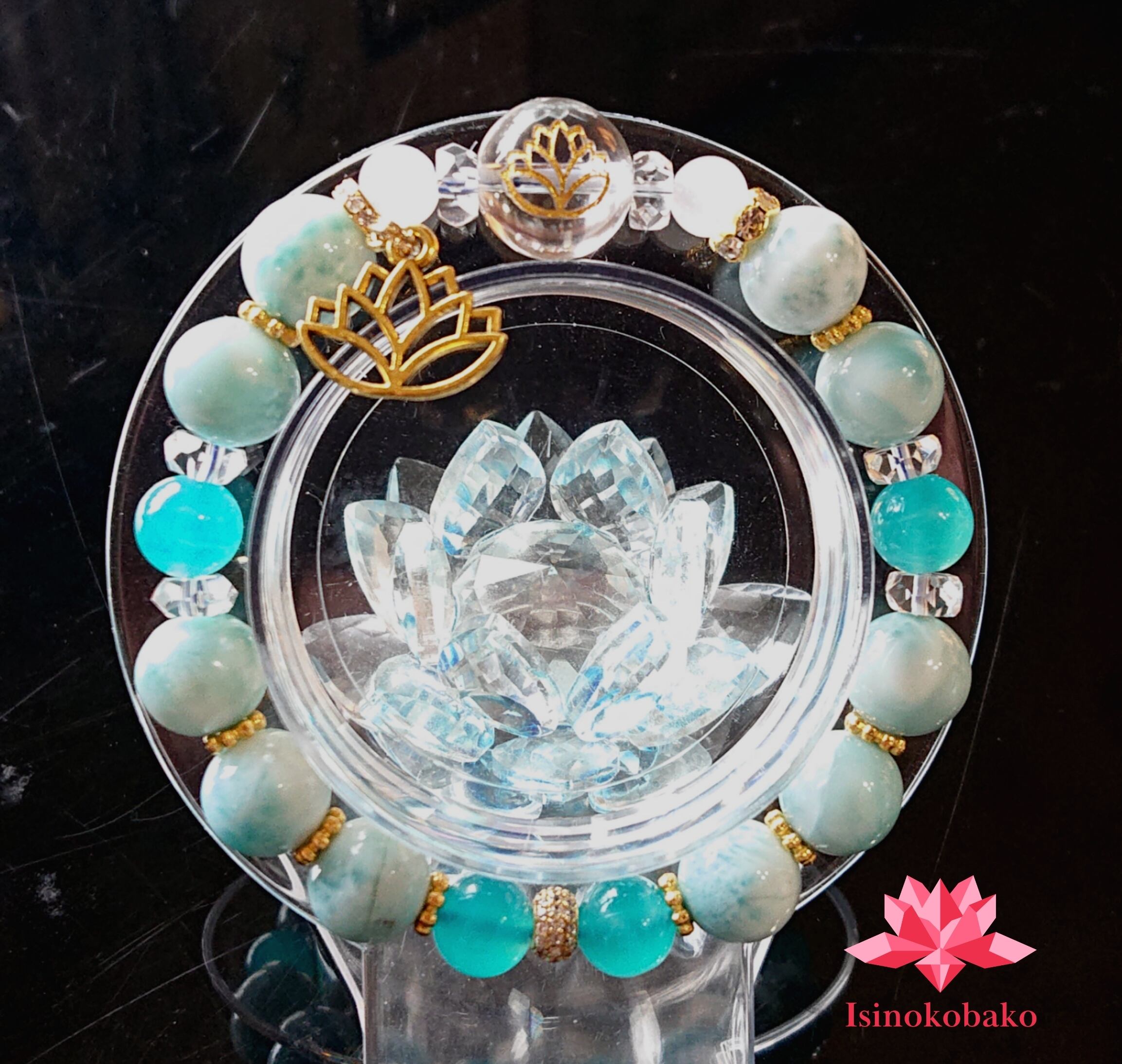 今回は、10mmのラリマーをふんだんに使用したブレスレットです。